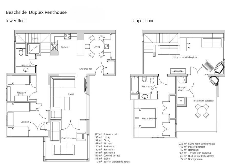 Una elegante escalera conduce a la planta superior, donde encontrará un segundo salón, con una acogedora chimenea. El dormitorio principal con baño en suite ofrece la máxima privacidad y lujo. La terraza semicubierta, equipada con barbacoa, es ideal para las noches de verano y las cenas acogedoras con amigos y familiares.