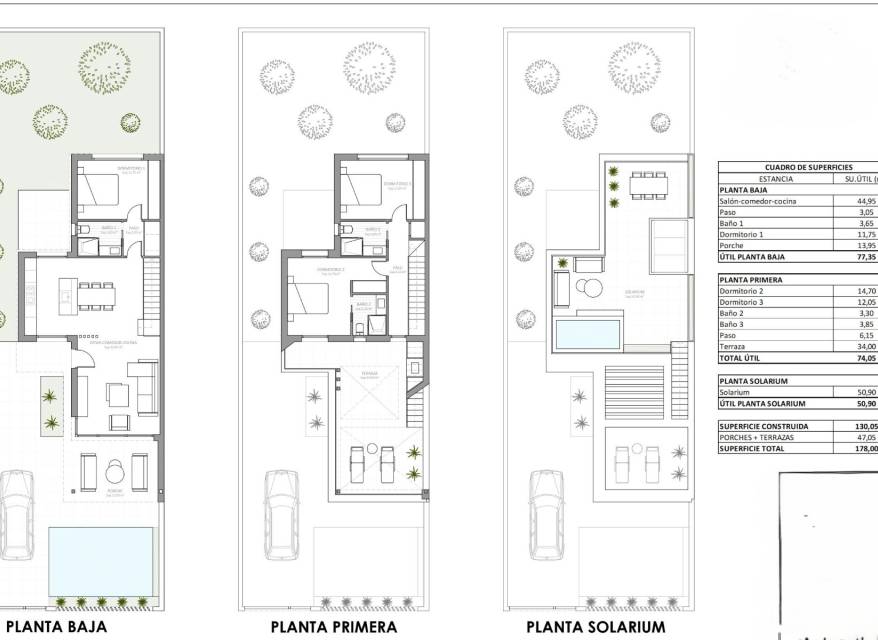 Chaque villa dispose de 3 chambres spacieuses, 3 salles de bains modernes, une piscine privée en option, un solarium avec pergola en option et un parking sur son propre terrain.