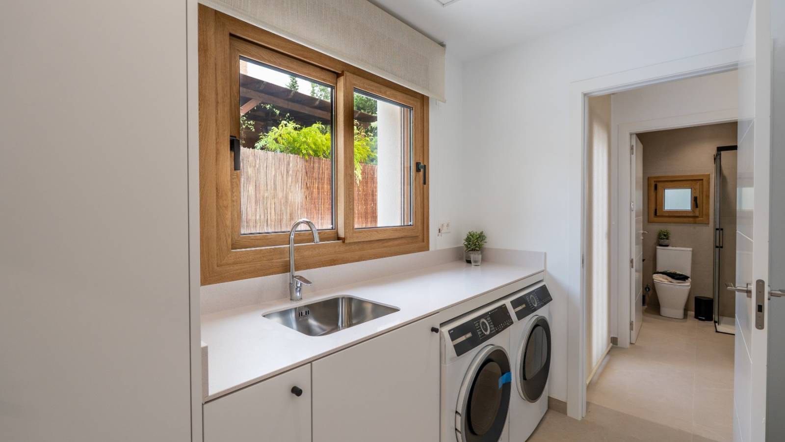 La maison dispose d'un système aérothermique économe en énergie et d'un intérieur élégant et fonctionnel avec des appareils Bosch de haute qualité et un éclairage bien pensé. Une porte dissimulée donne accès à la buanderie, au garage et à une salle de bains extérieure pratique.