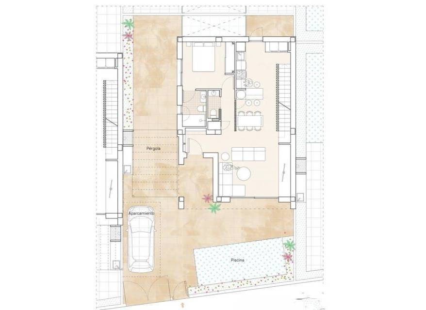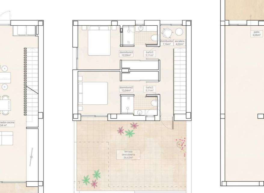 Villa's bestaande uit twee verdiepingen met kelder en Engels patio. De villa's zijn voorzien van open keuken, woon en eetkamer een slaapkamer en badkamer en suite op de begane grond e, 2 slaapkamer en badkamers en suite en groot terras op de eerste verdieping. Privé tuin met zwembad en barbecue plaats. Parkeerplaats op perceel. Electrische stopcontacten voor het opladen van auto's en een individuele privé toegang vanaf de straat.