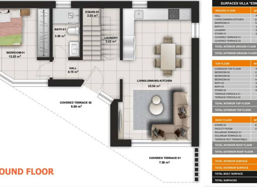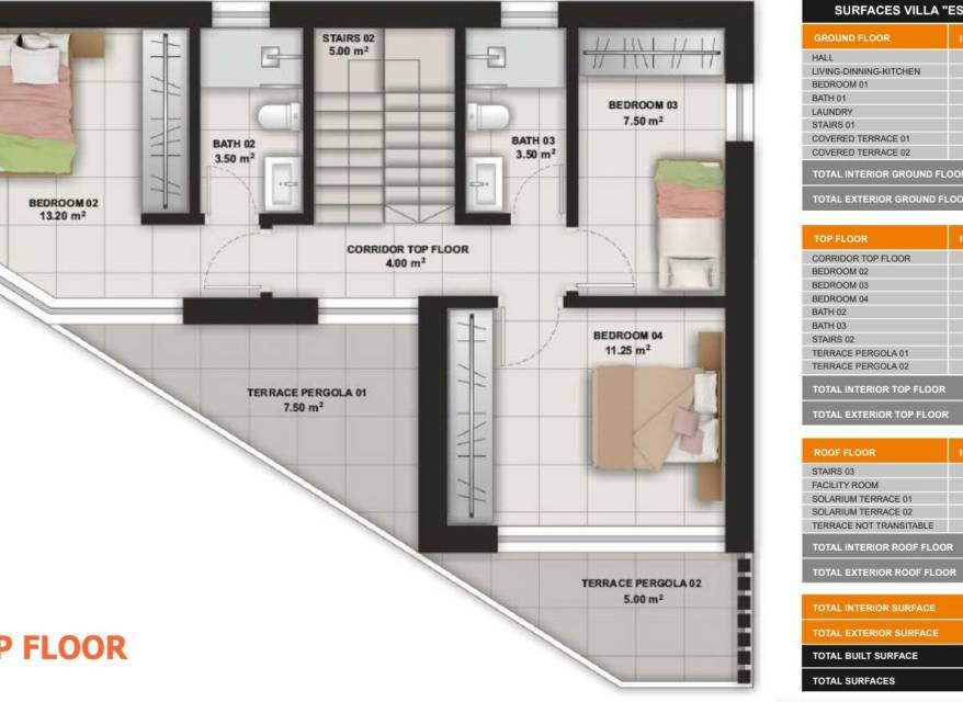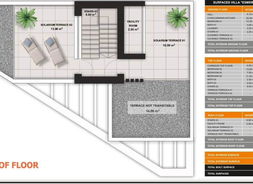 The first floor offers three additional bedrooms, including a master bedroom with en-suite bathroom and access to a private terrace. Two of the bedrooms have their own terrace, perfect for enjoying the morning sun. An internal staircase leads to the large rooftop solarium—ideal for relaxing, sunbathing, or spending cozy evenings under the stars.